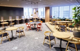 全面ガラス貼りの1階ラウンジで、北欧モダンのインテリアがあります。ラウンジにはテーブル席から半円状のソファ席まで様々な座席を用意しており、お客様や社内打ち合わせなどにご利用できます。個室の広さも2名~用意があり、テレワーク×コンパクトなオフィスを実現することもできるでしょう。