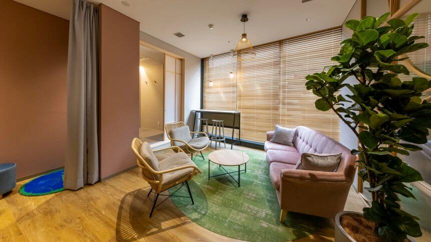 ザ プレイス(The Place)心斎橋は、デザイナーズオフィス事業を手掛ける株式会社ヴィスが運営するオフィスです。オフィスのコンセプトは「TSUMUGI」です。「多様化する働き方に対応した場づくりをしたい」という想いを込めて作られました。内装はモノトーンカラーでまとめた落ち着いた空間です。大きな窓ガラスから日光が入り、明るく開放的な雰囲気の中で仕事に取り組めます。オフィス内にはグリーンが配置されており、癒やし空間も演出しています。