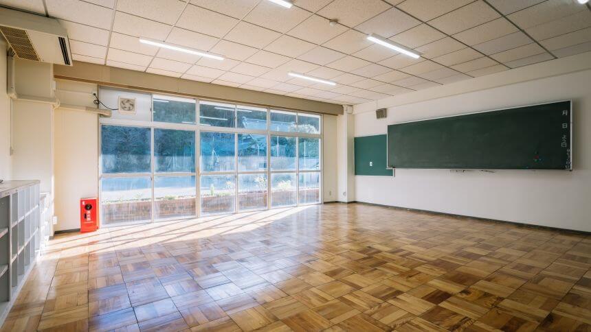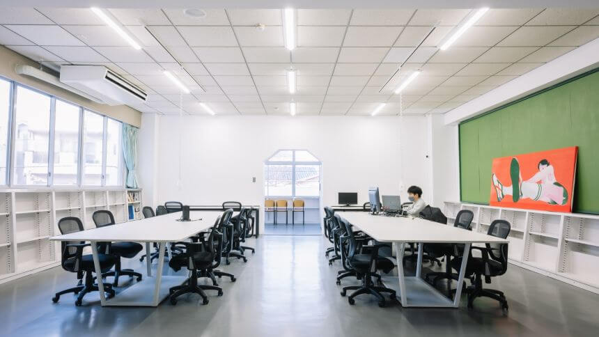 単独型のオフィスは1階に1部屋、2階に7部屋用意されています。教室を活用しているため、広々とした空間、高い天井、大きな窓から差し込む自然光の中で作業が可能です。壁や床などはリノベーションされており、廃校舎を活かしつつ、清潔感のある空間となっています。