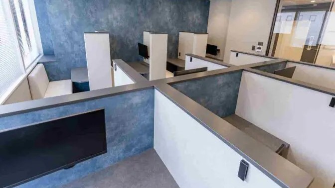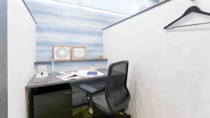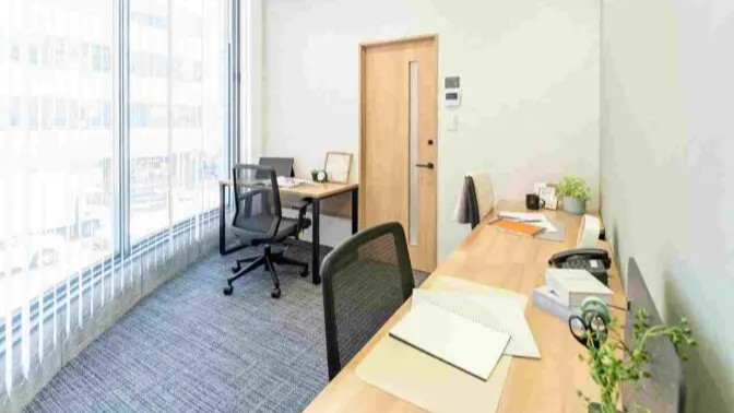 1名‐3名用の個室が用意されており、白い壁とシンプルな什器で構成されたすっきりとした空間です。必要なものだけが揃ったミニマルな環境で、長時間の作業でも集中が途切れにくい印象です。小規模事業者や個人の作業拠点に向いています。