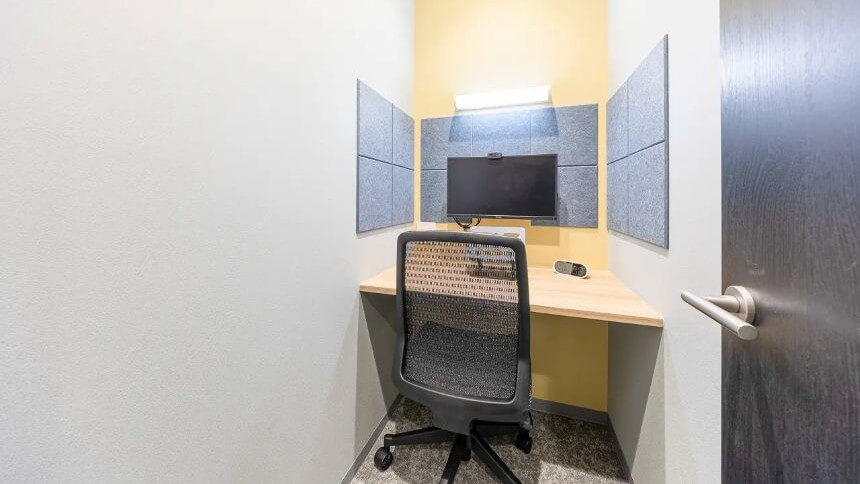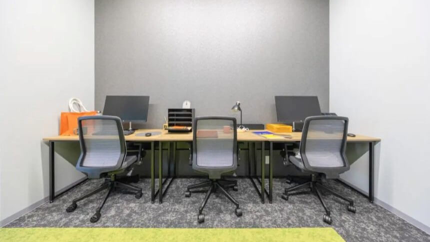 2〜6名で使用できる個室オフィスです。木目×白の落ち着いた内装にデスクとチェアが配置されたシンプルな内容が魅力。視線のノイズが少なく、オンライン会議や集中作業に向いています。照明の明るさも落ち着いており、長時間の作業でも負担が少ないよう配慮されています。