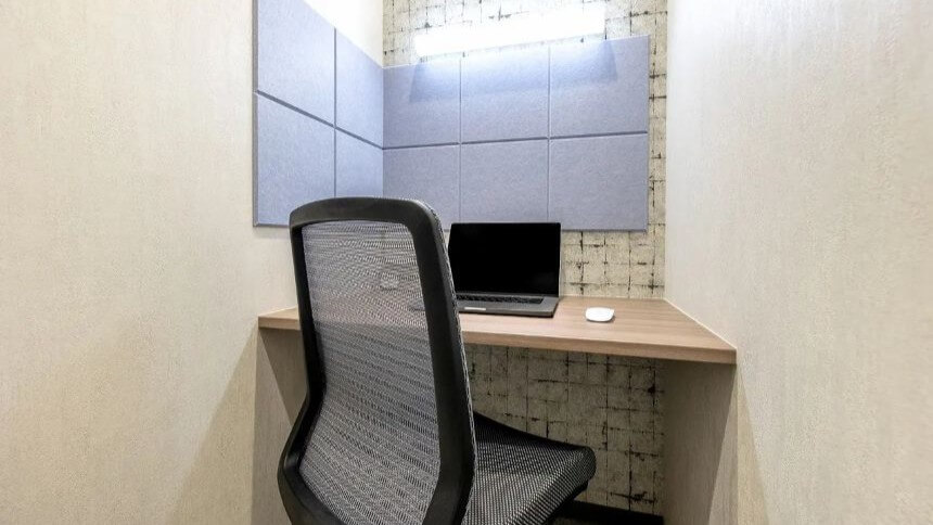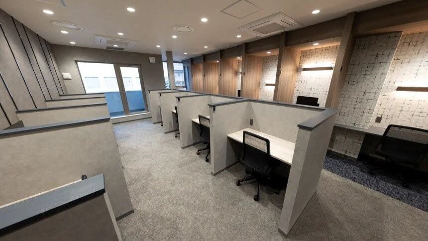 個室は、月額約39,600円から利用できる比較的手頃な価格で利用できます。付帯サービスとして法人登記、プリンター、駐輪場、専用ポストやロッカーなど、ビジネスに必要な設備が揃っており、セキュリティ環境も整っています。さらに、会議室も完備されており、個室利用者は月5時間まで無料で予約利用が可能です。共有スペースは2階・3階を中心に展開され、「カフェブース」「ワークブース」「テレフォンブース」など目的に応じて使い分けられる空間設計がなされています。特にカフェブースは木の温もりとグリーンが調和した穏やかな空間で、作業とリラックスの両立に適した環境です。