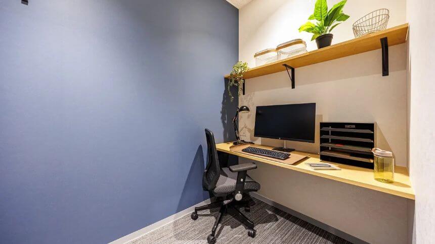 1名から3名まで利用可能な完全個室型のレンタルオフィスが用意されており、月額57,200円から利用できます。付帯サービスとして、デスクやチェアなどのオフィス基本設備に加え、個人事業主や小規模法人に向けた法人登記、ポスト、ロッカーといったオプションも充実しており、事業スタイルに合わせた柔軟な使い方が可能です。共有空間も充実しており、109席のフリーシートに加え、用途に応じて使い分けできるカフェブース、ワークブース、テレフォンブース、ミーティングブースなどが整備されています。