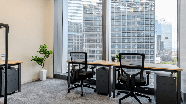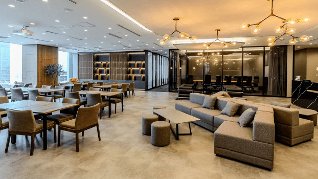 個室は1名から50名規模まで対応しており、月額約6万円から利用可能です。法人登記、郵便対応など付帯サービスも提供され、有人受付・有人警備のため、安心して利用できます。共有空間も広く、ビジネスラウンジ、会議室、電話ブースなどが整備され、来客時にも活用が可能です。ビジネスラウンジは一等地を象徴するラグジュアリーな内装で、テーブル席やソファー席、カウンター席が設けられており、窓からは大阪の都心部を一望できます。