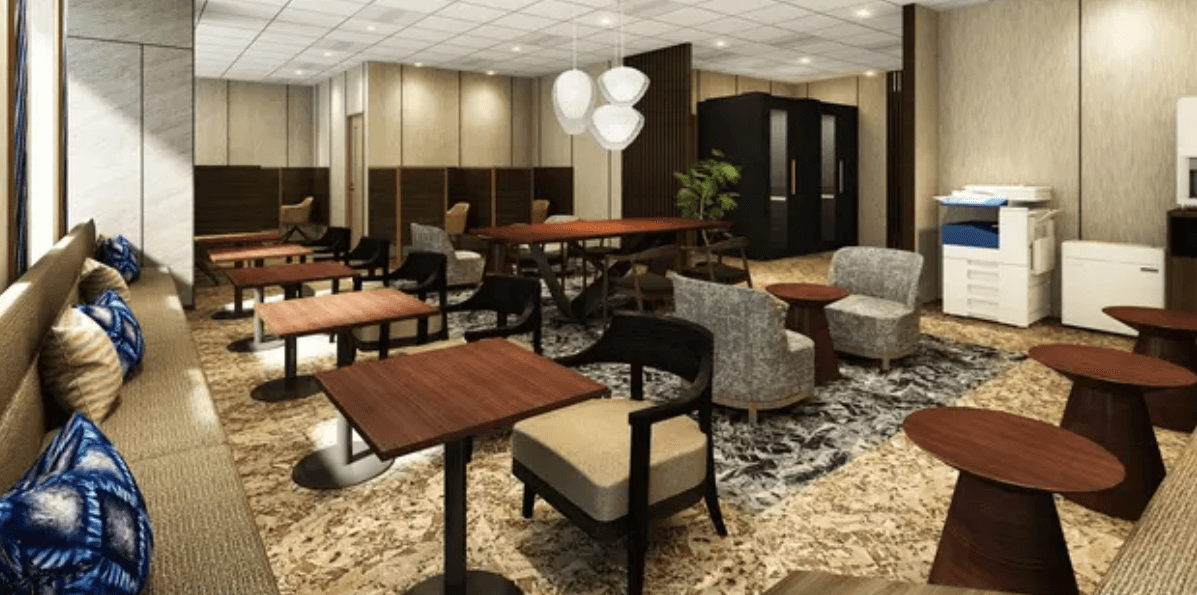 広々としたラウンジやコワーキング席、テレフォンブースが整っており、作業、打ち合わせ、気分転換がすべて館内で完結します。落ち着いた色調の内装で統一され、ビジネスシーンに馴染みやすい上質な雰囲気が漂います。