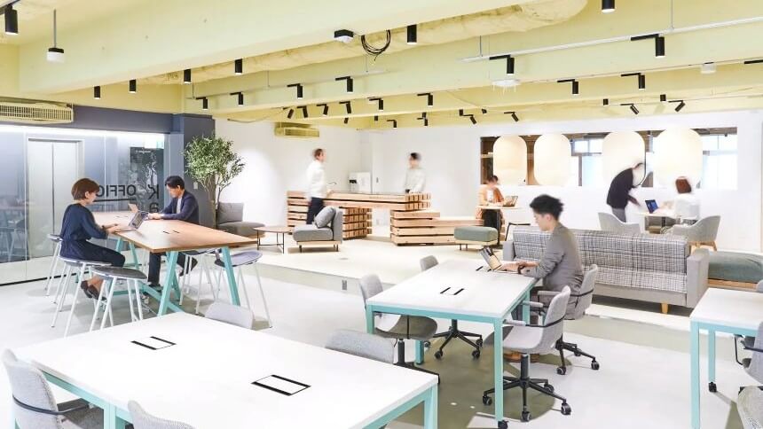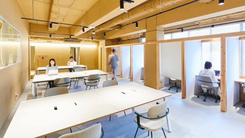 特徴は「明るさ」と「視界の抜け」を意識したレイアウト。白×木目の組み合わせは清潔感があり、照明も均一で手元が見やすく、長時間作業しても目が疲れにくい環境です。個室はシンプルに整えられていて、余計な装飾がないためオンライン会議の背景としても使いやすいデザインです。共有ラウンジは余白をしっかり取った席配置で、密集感がなく気持ちが軽くなる快適な空間です。小規模ながらも静けさが保たれており、作業や会議用途で「ちょうど良い」スペースを求める人に適した空間です。