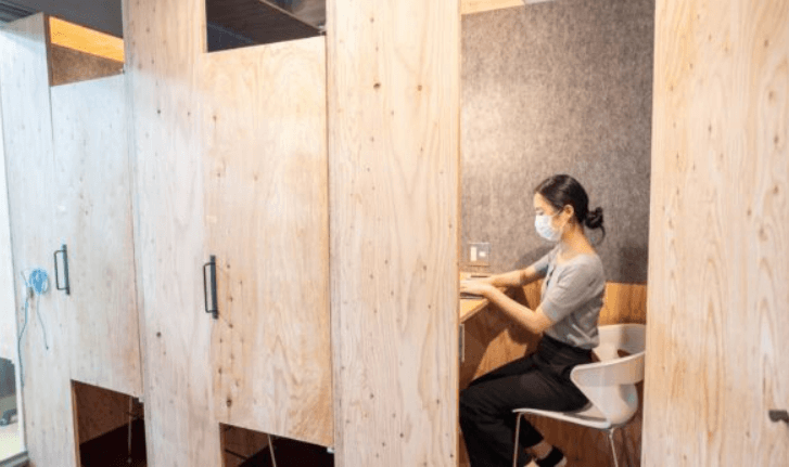 「mass×mass」の特徴として、まず木目素材を多用したインテリアデザインと、観葉植物や緑を配したナチュラルな雰囲気が印象的です。例えば、シェアオフィス「TENTO」には間伐材を使用し、温かみとこだわりが感じられる造りになっています。 入退室管理はICカードが採用されており、セキュリティ面も安心です。 また、コワーキング利用・ドロップイン利用・専有スペース利用が選べ、会議室やイベントスペースの使用実績も多く、ビジネスコミュニティを重視した環境が整っています。