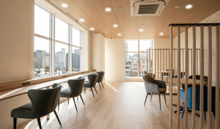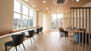 1名-7名程度に対応できる完全個室型のオフィスが用意されています。AからIタイプまでの部屋があり、用途や規模に応じた選択が可能です。すべての個室は24時間365日利用可能で、法人登記にも対応しています。付帯サービスとしては、予約制で無料利用できるミーティングルームや、明るく開放的なラウンジスペース、郵便ボックス、駐輪場、複合機、宅配ボックス、給湯室などが整備されており、働くうえで必要な設備が一通り揃っています。共有空間のフリーラウンジは、大きな窓が備え付けられており、カウンター席とテーブル席が設置されています。