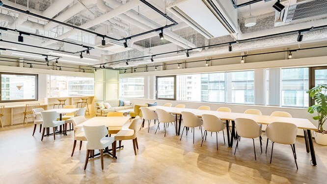 オフィス8階には、明るく開放的なコミュニケーションラウンジが備えられています。年始年末や点検日等を除き、 8:00〜22:00の間で利用可能です。入居者限定で18:30〜21:00の時間帯の貸切利用も可能です。
