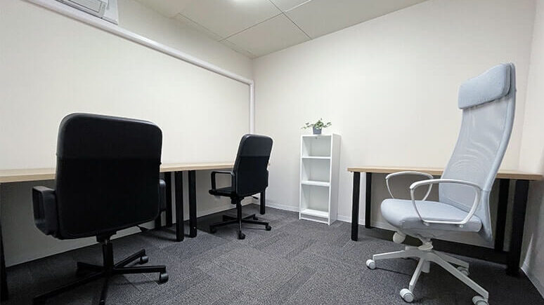 1名‐3名用の個室が並んでいるオフィスです。各部屋には鍵も付いていますので、機密事項なども安心して管理できます。標準装備としてデスクと椅子が設置されており、棚もあります。壁にコートなどをかけるハンガーもあり、エアコンも設置されているので温度調整も容易に行えます。