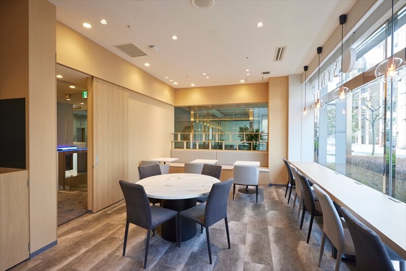 路面に面した1階にラウンジオフィスがあります。ラウンジには半個室型のミーティングブースもあり、会議室を借りなくても簡単な打ち合わせや面談・面接が可能です。また、複合機やシュレッダーも完備されています。