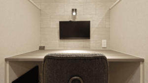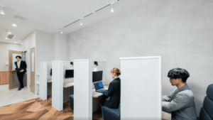 ラウンジは静かに仕事ができる落ち着いた空間設計で、会話の有無や作業のリズムに合わせて席を選べます。モニター付きの席や資料を広げやすいテーブルなど、働き方に合わせた過ごし方ができる点が特徴です。休憩と集中が共存する雰囲気があります。