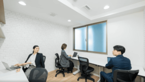 少人数チームや一人での業務に向いた完全に区切られた個室です。落ち着いたトーンの内装が集中を促し、来客対応にも相応しい印象があります。セキュリティが整っており、拠点として安心して利用可能なワークスペースです。
