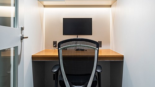 1名用完全個室を8室設置。明るい壁面と天井高を活かしたガラス仕切り、暖色照明が落ち着いた印象を演出。モニター・机・椅子が備え付けられており、入居即日からWEB会議・集中作業が可能です。