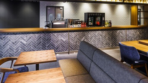 エントランスラウンジと隣接テラスは、木目調のインテリアにグリーンが配置され、リラックス感を演出しています。カフェコーナーも設置され、打ち合わせや休憩・作業モードの切り替えを自然に行うことができます。