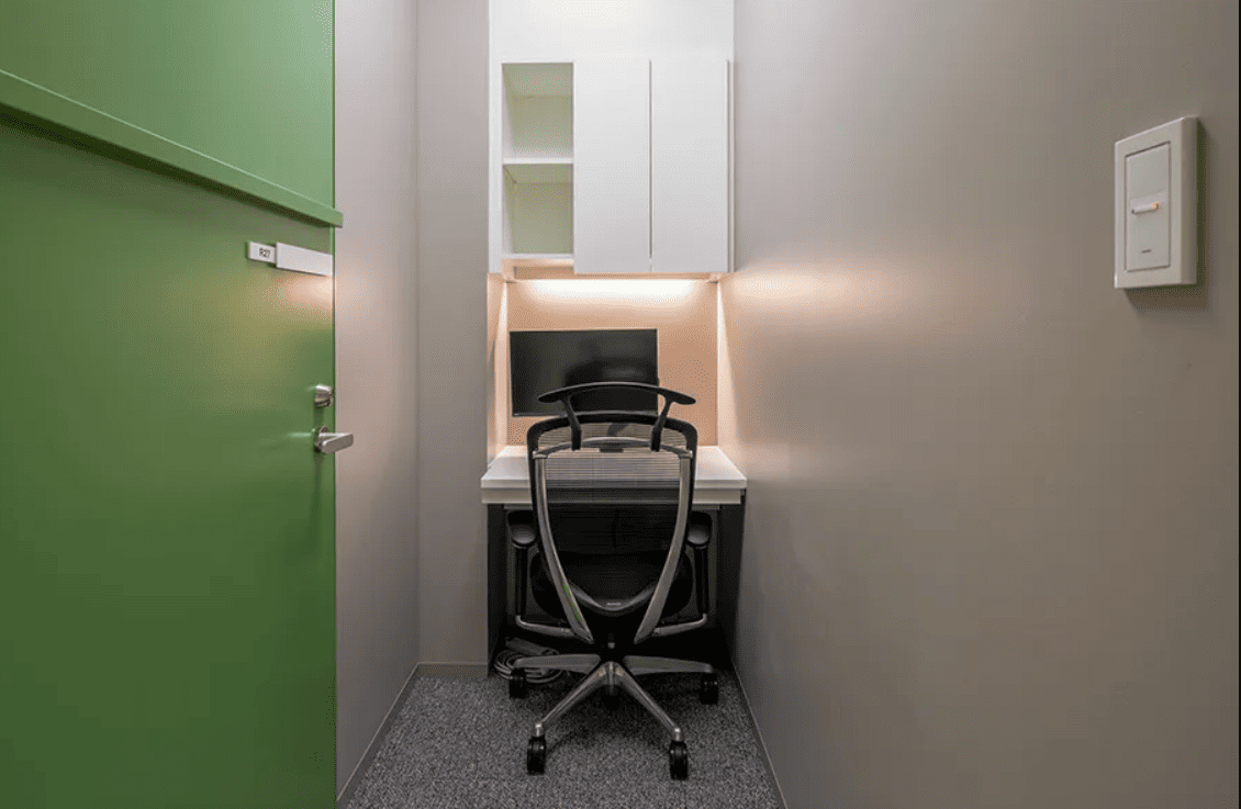 1〜18名用の個室オフィスを設置しています。ガラスや木目を活かした壁面・床材、暖色系照明で落ち着きと開放感を両立した内装が魅力です。昇降式デスク・高機能チェア完備で即業務可能な仕様です。