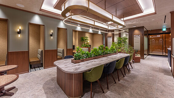 ラウンジは、バイオフィリックデザインが施され仕事にもリラックスにも最適な空間です。利用可能時間がビジネスラウンジの営業時間内に限られるラウンジオフィスプランと、全拠点利用・24時間365日利用が可能なラウンジプレミアプランがあります。